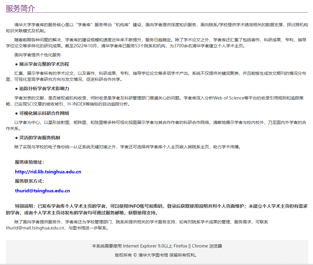 清华大学学者库的服务核心是以“学者库”服务带动“机构库”建设,面向学者提供深度知识服务,面向院系/学校提供学术绩效相关的数据支撑,探讨跨机构知识关联模式及机制。